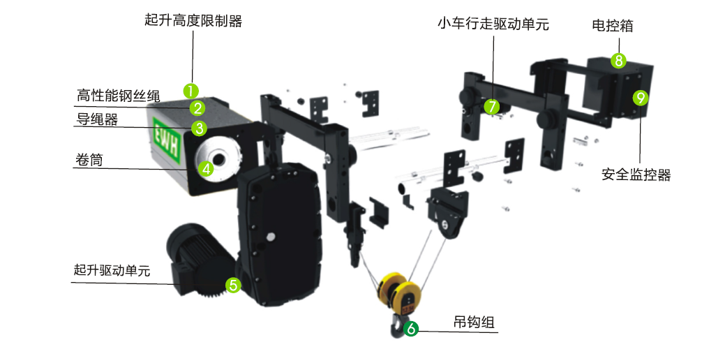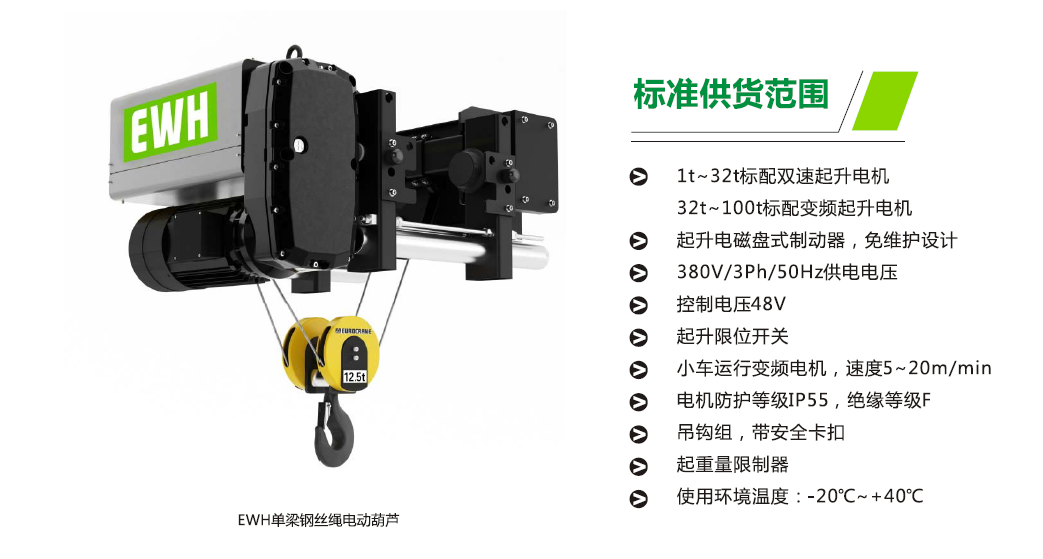 起升機構 (歐式鋼絲繩葫蘆)法蘭泰克憑借的技術和豐富的行業經驗,從客戶的需求出發,基于模塊化設計理念,研發出擁有多項的EWH系列鋼絲繩電動葫蘆:質量好,性能好。EWH電動鋼絲繩葫蘆能夠為您提供更好的物流搬運解決方案,保障設備運行的安全性。